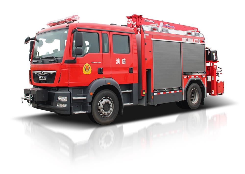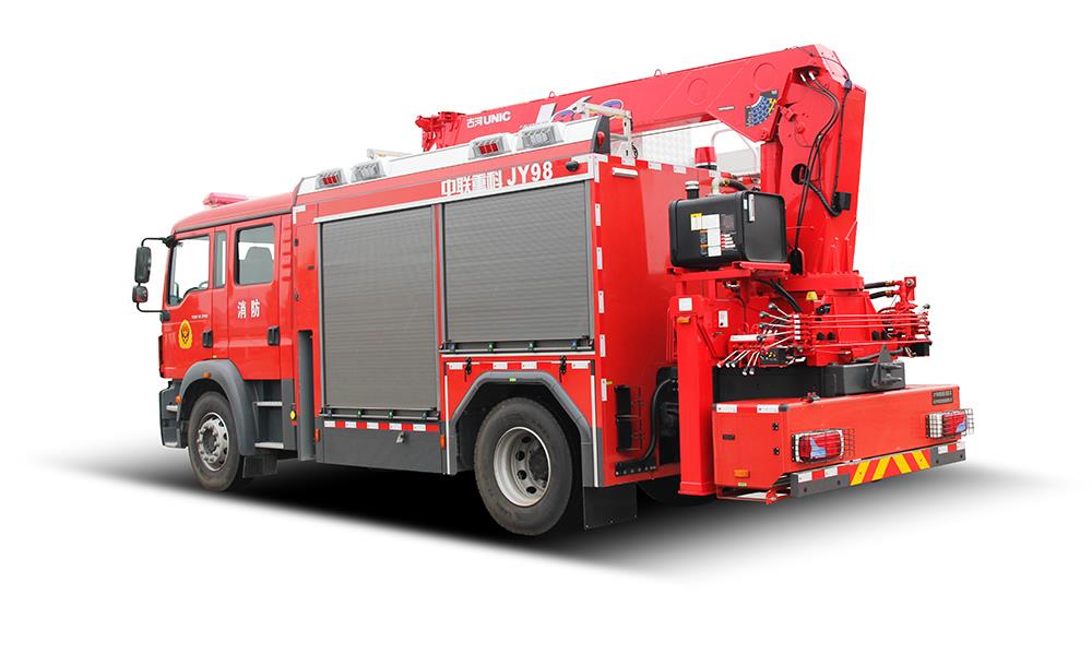 中联重科JY98型抢险救援消防车,结合国内外消防车的先进理念和消防实战创新设计而成,整车结构紧凑,越障能力强,可装备绞盘,升降照明系统,起吊机,液压破拆工具组,侦检器具,救生器具等超过98件抢险救援器材,是集照明,供电,牵引,起吊,破拆,侦查,救援等功能于一体的多功能消防车 天天影视,具备强大的抢险功能和综合救援能力,是火灾,地震,抗洪,车祸等各类灾害抢险救援的主力车型, 。